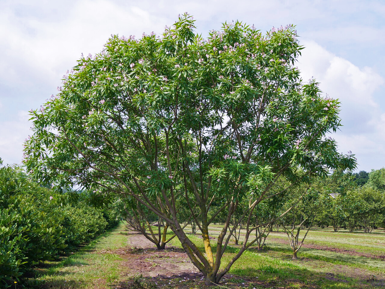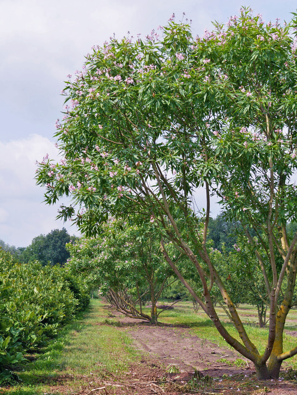 Chitalpa tashkentensis 'Summer Bells' blüht im juni, juli.