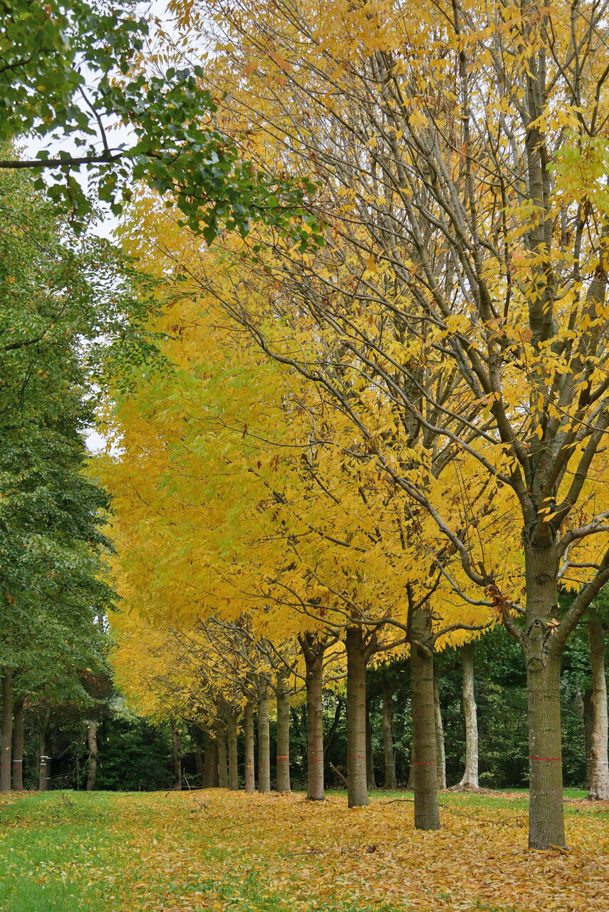 Die Blätter der Fraxinus americana 'Skyline' werden im Herbst orange, rot.