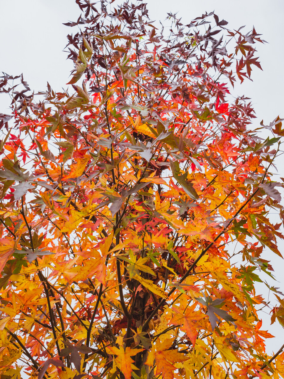 Die Blätter der Liquidambar styraciflua 'Worplesdon' werden im Herbst gelb, orange, rot.