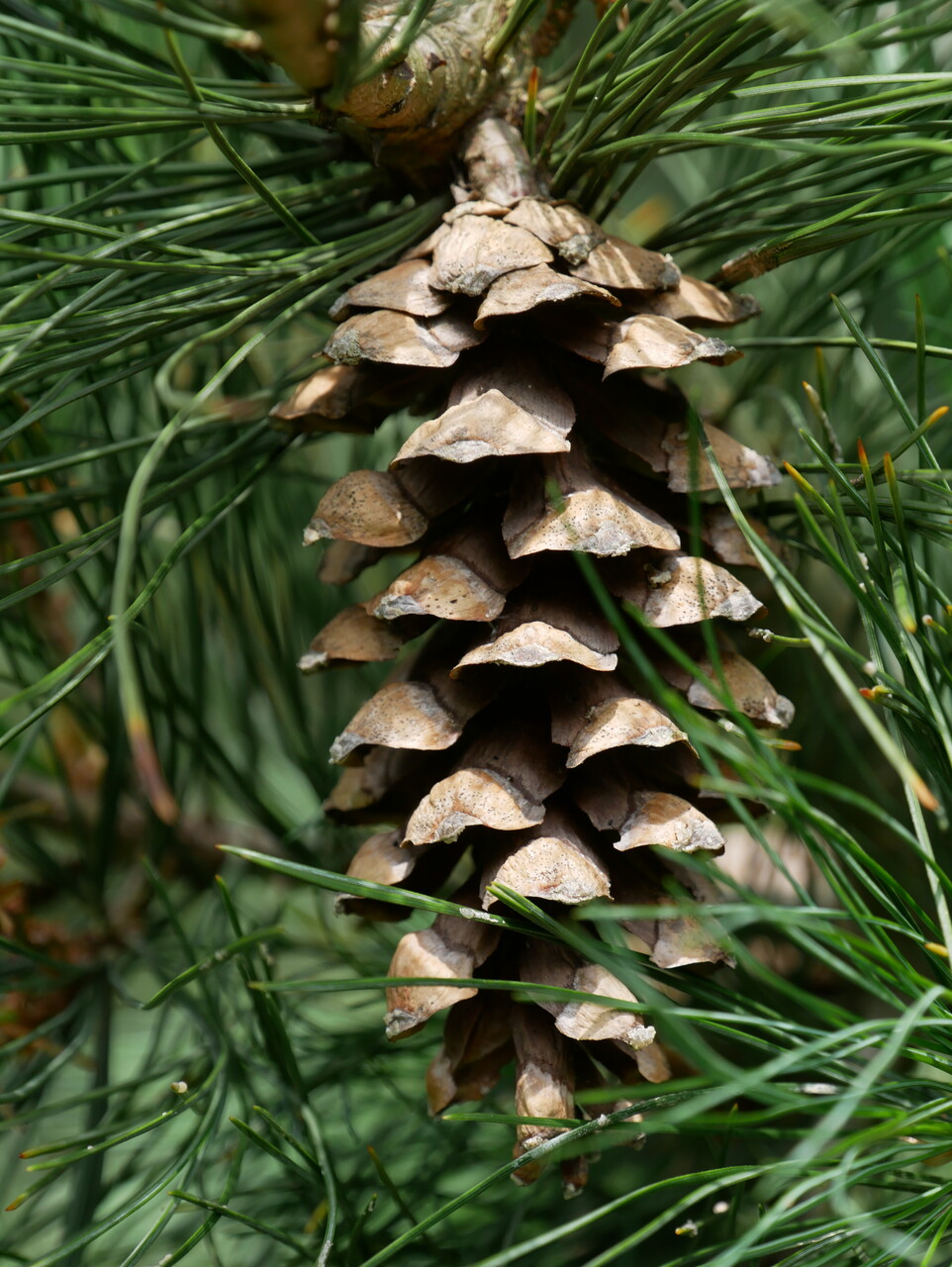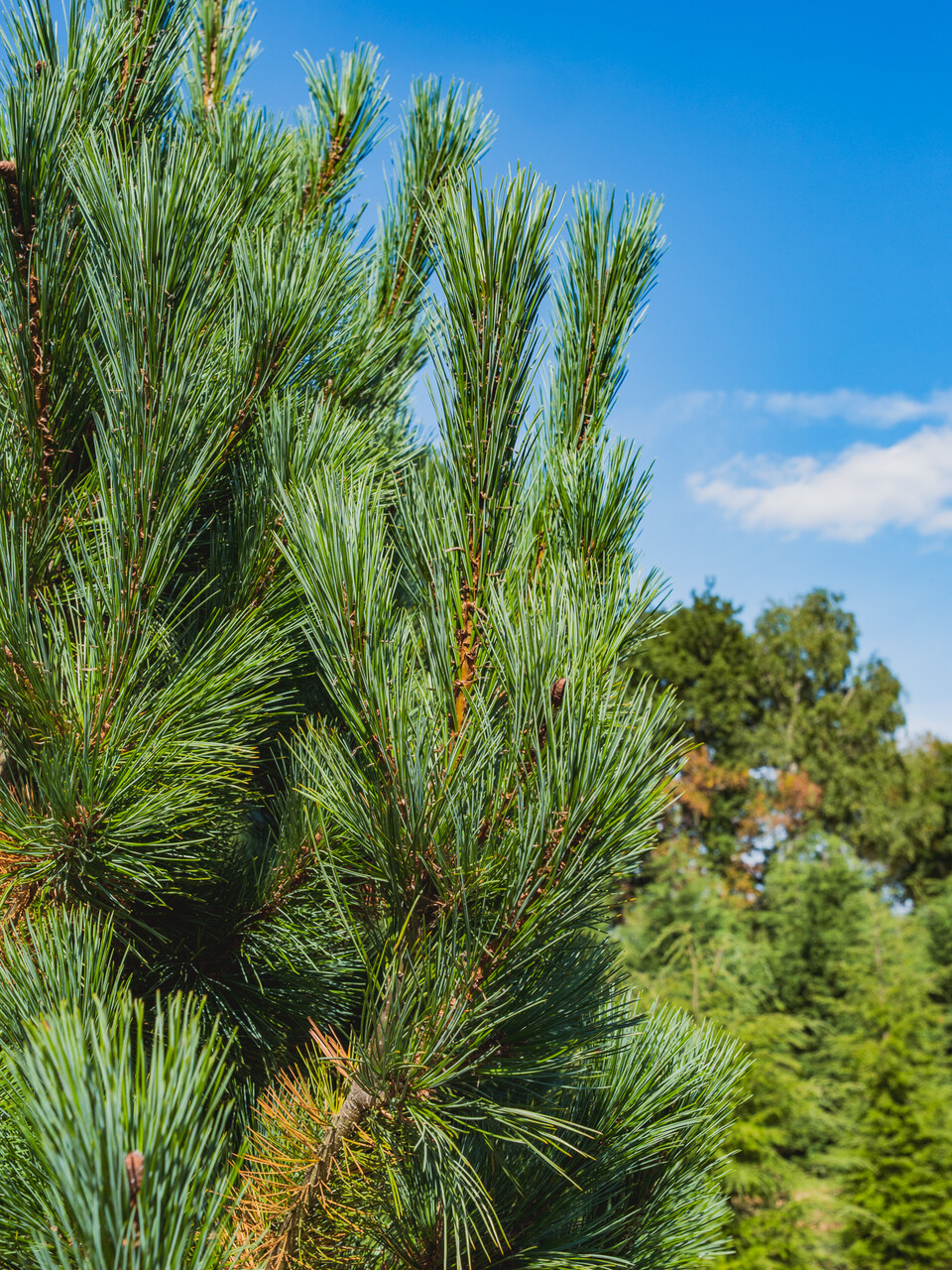 Nadeln, zu fünf zusammen, graugrün, 7 - 11 cm, wintergrünes Blatt