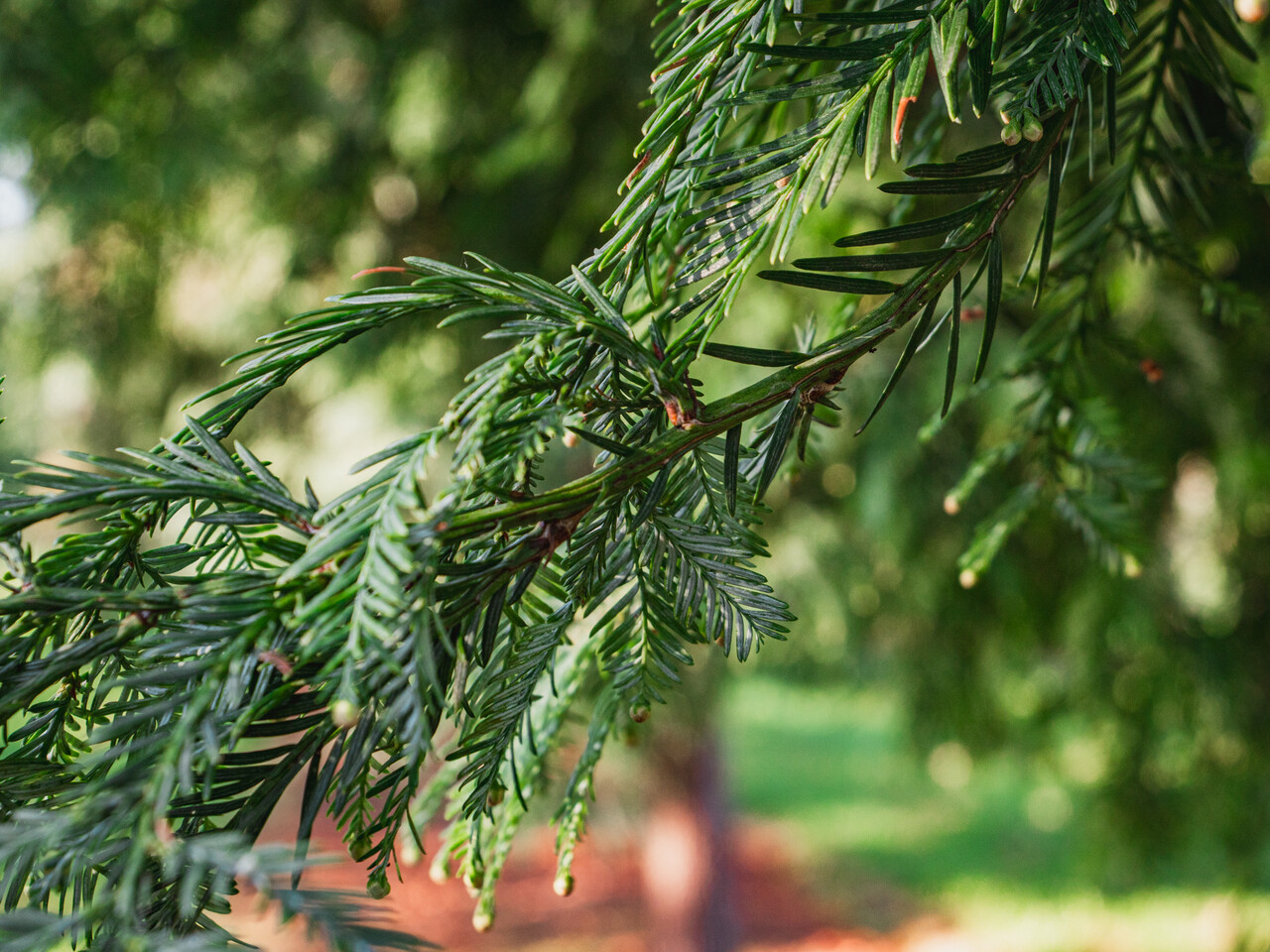 Sequoia sempervirens 'Winter Blue' blüht im januar.