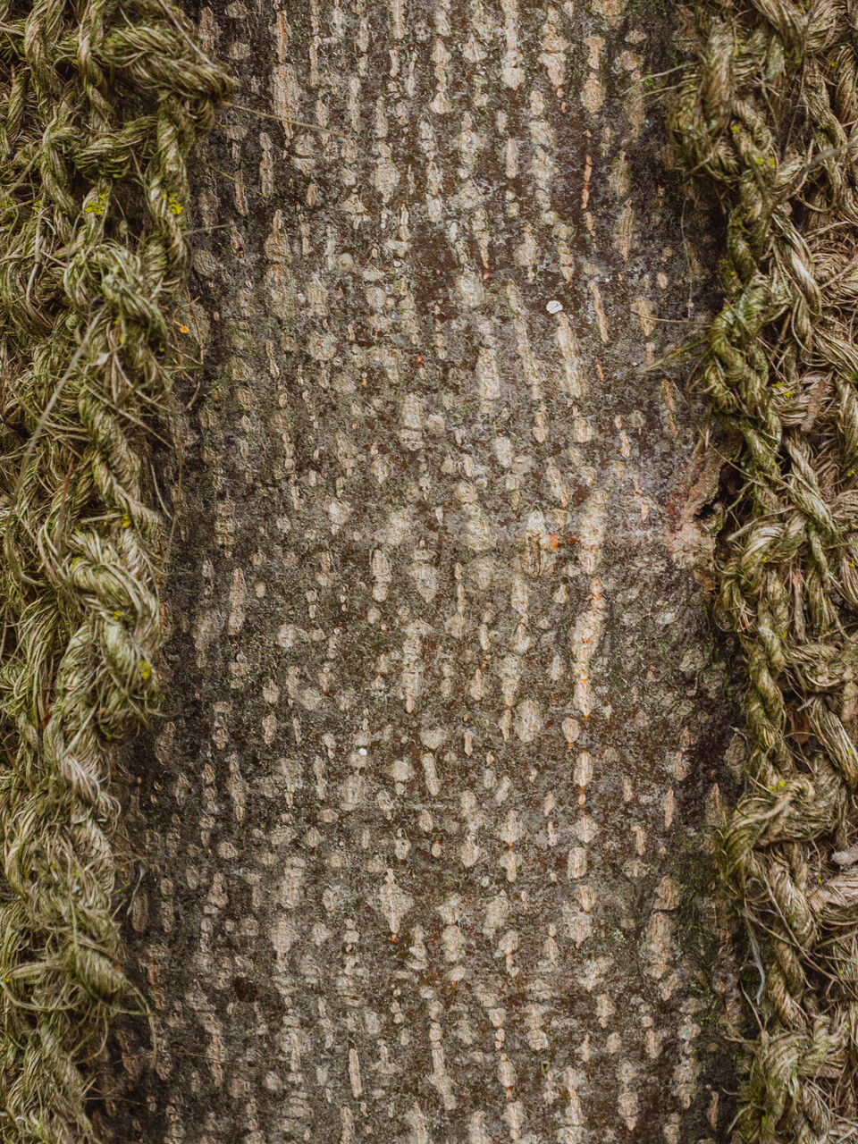 dunkelbrauner, gefurchter Stamm, Zweige grün, später rotbraun