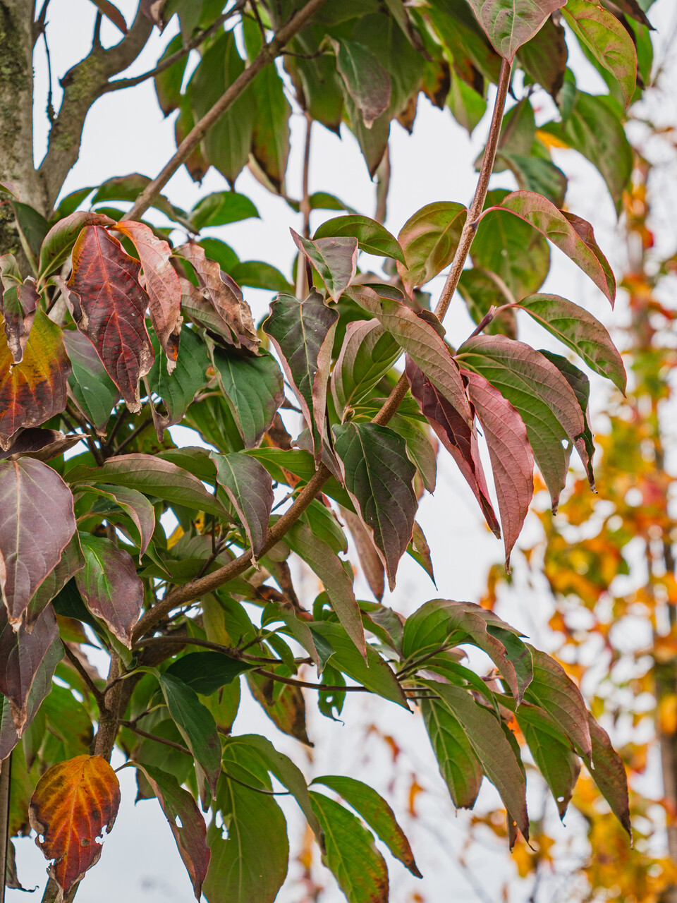 Die Blätter der Cornus kousa var. chinensis werden im Herbst gelb, rot.