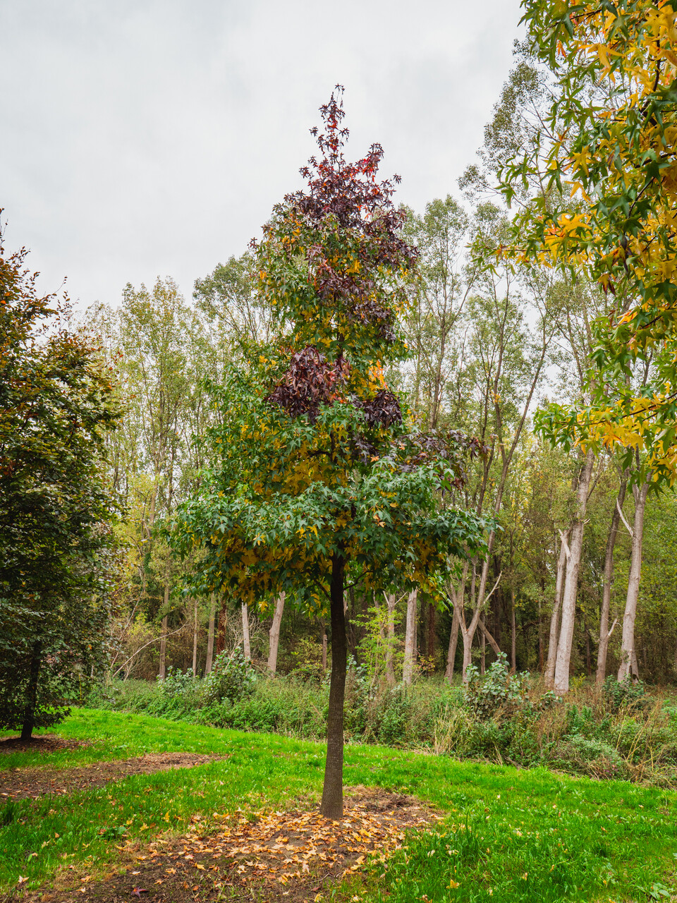 Die Blätter der Liquidambar styraciflua werden im Herbst gelb, orange, rot, lila.