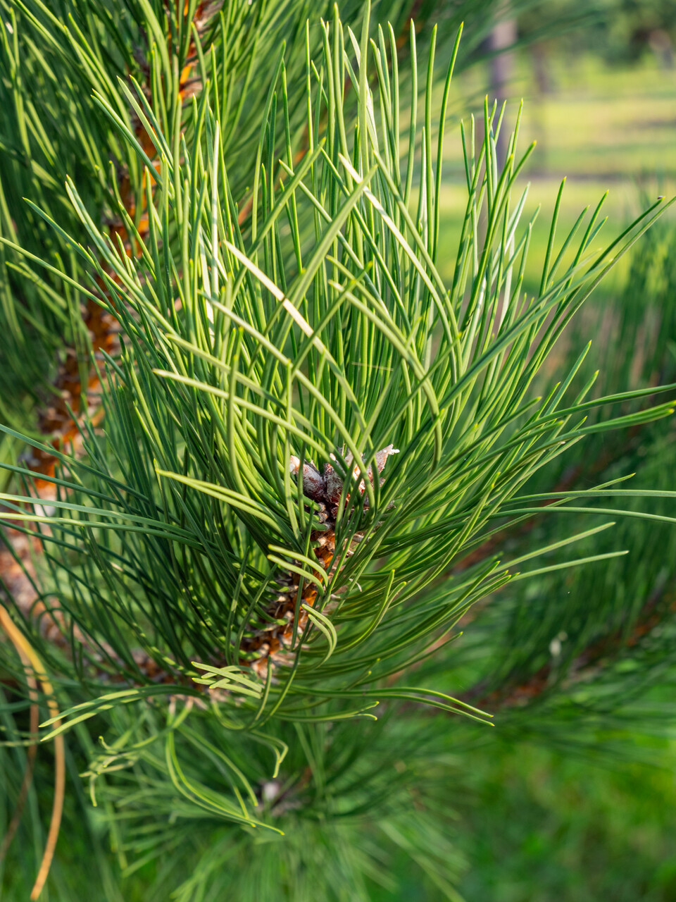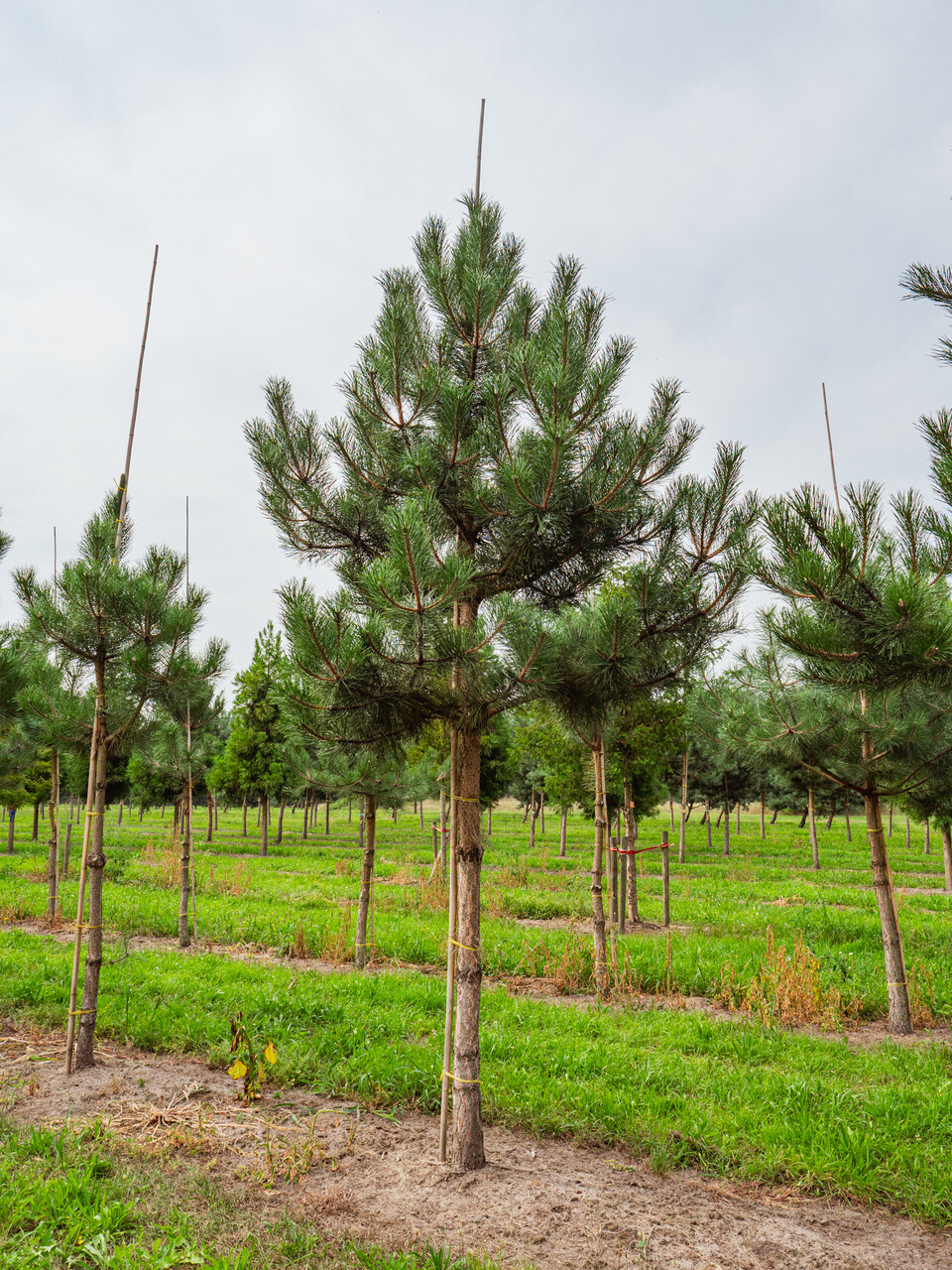 Ein sehr großer, imposanter Baum mit auffälliger Rinde. Anzuwenden als niedrig verzweigter oder als aufgekrönter Baum. Wenn der Baum frei stehen bleibt, bleiben die Äste bis zur Basis gefüllt. In seiner Jugend noch pyramidenförmig wachsend, mit zunehmendem Alter jedoch breiter werdend mit schirmförmiger bis runder Form. Die schwarzgraue Rinde ist tief gefurcht und vor allem bei alten Bäumen besonders dekorativ. Die Äste sind kahl und gelbbraun. Die Nadeln stehen paarweise zusammen und sind auffallend dunkelgrün, steif und leicht stechend. Die fast symmetrischen Zapfen sind hellbraun und hängen gewöhnlich paarweise oder einzeln. Leere Zapfen fallen im Frühmit giftigen Teilenhr herab. Geeignet für viele Bodenarten, gedeiht sogar auf trockenem, kalkreichem Boden. Lässt sich gut in Form stutzen und eignet sich daher auch für kleinflächige Standorte. Seewindbeständig und äußerst resistent gegen Luftverschmutzung.