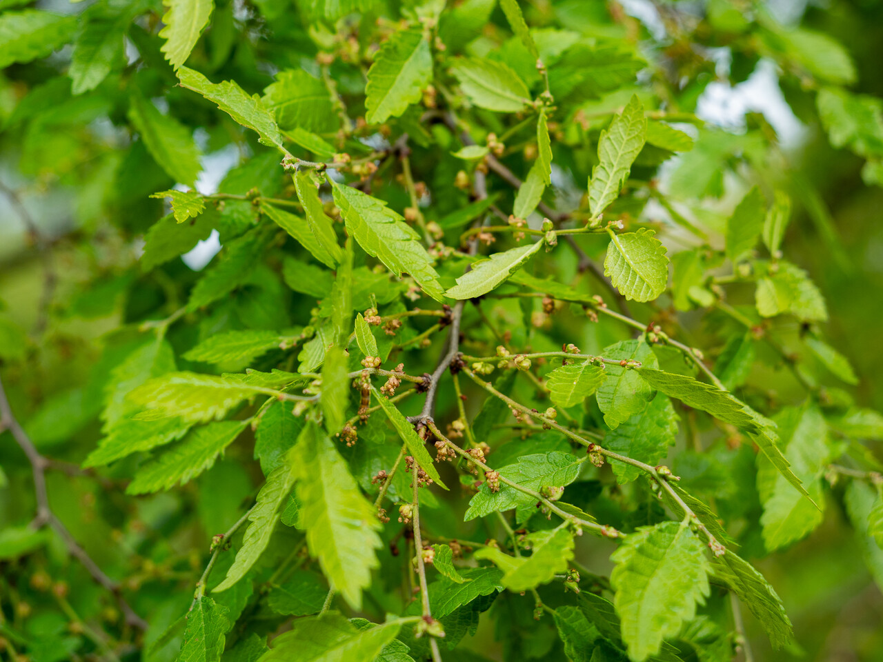 Zelkova carpinifolia 'Verschaffeltii' blüht im april.