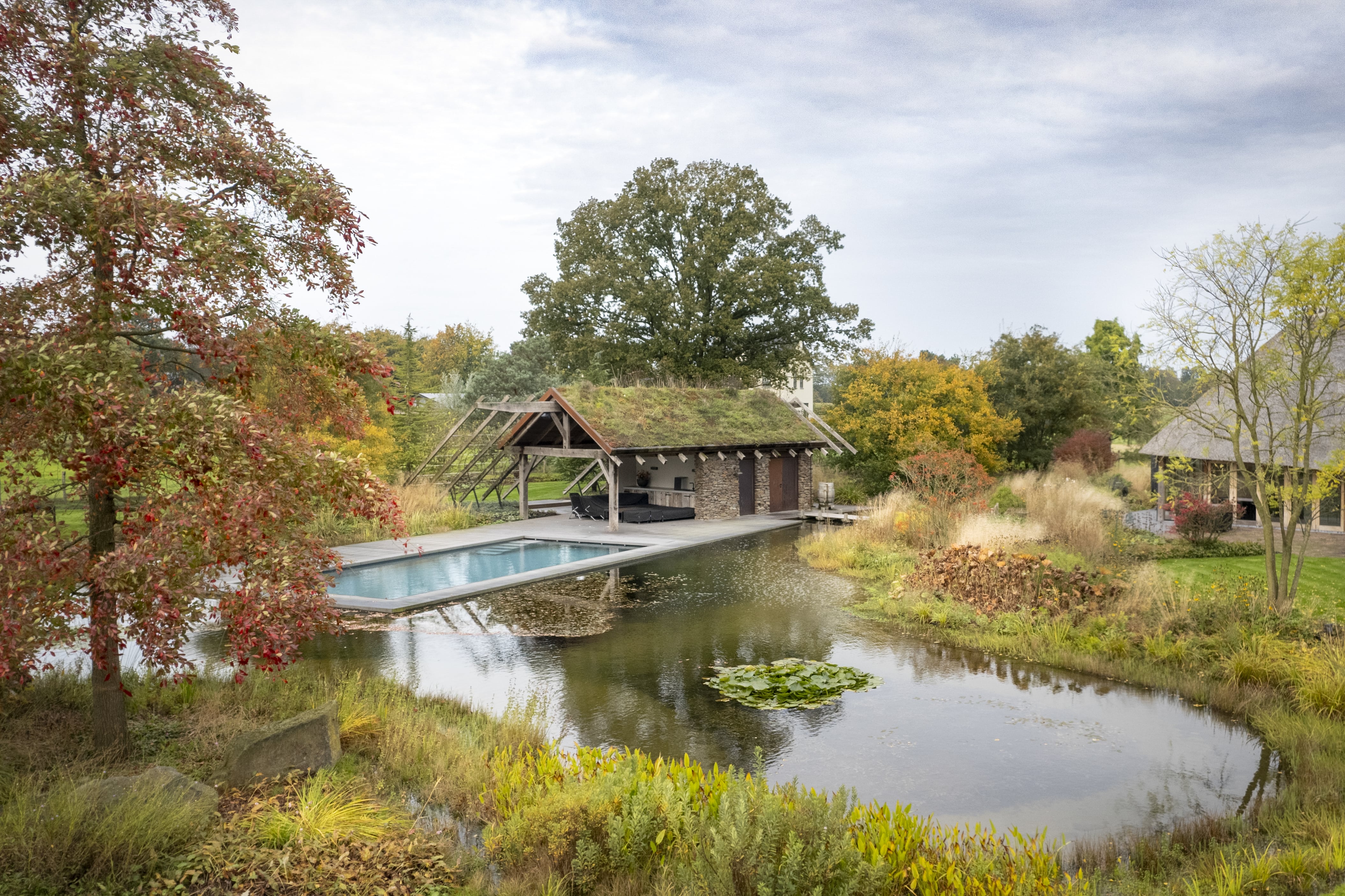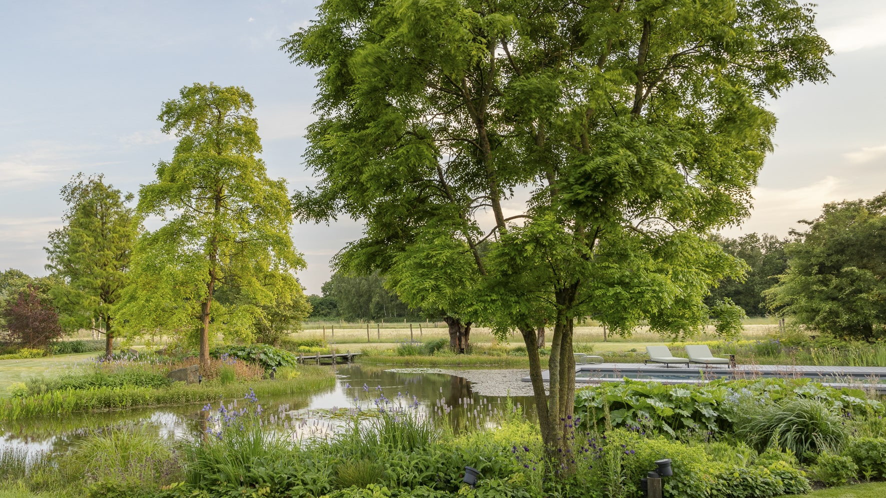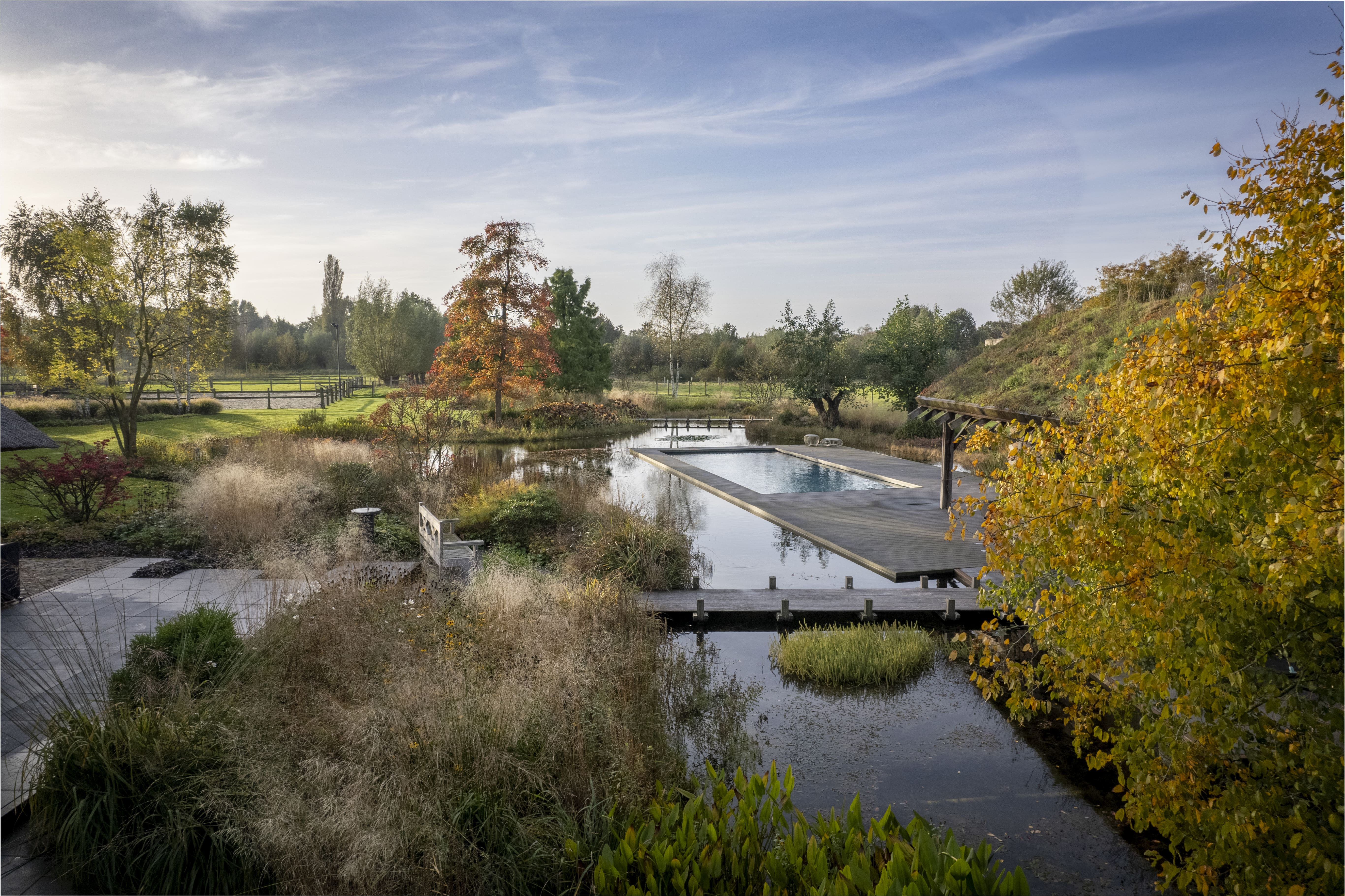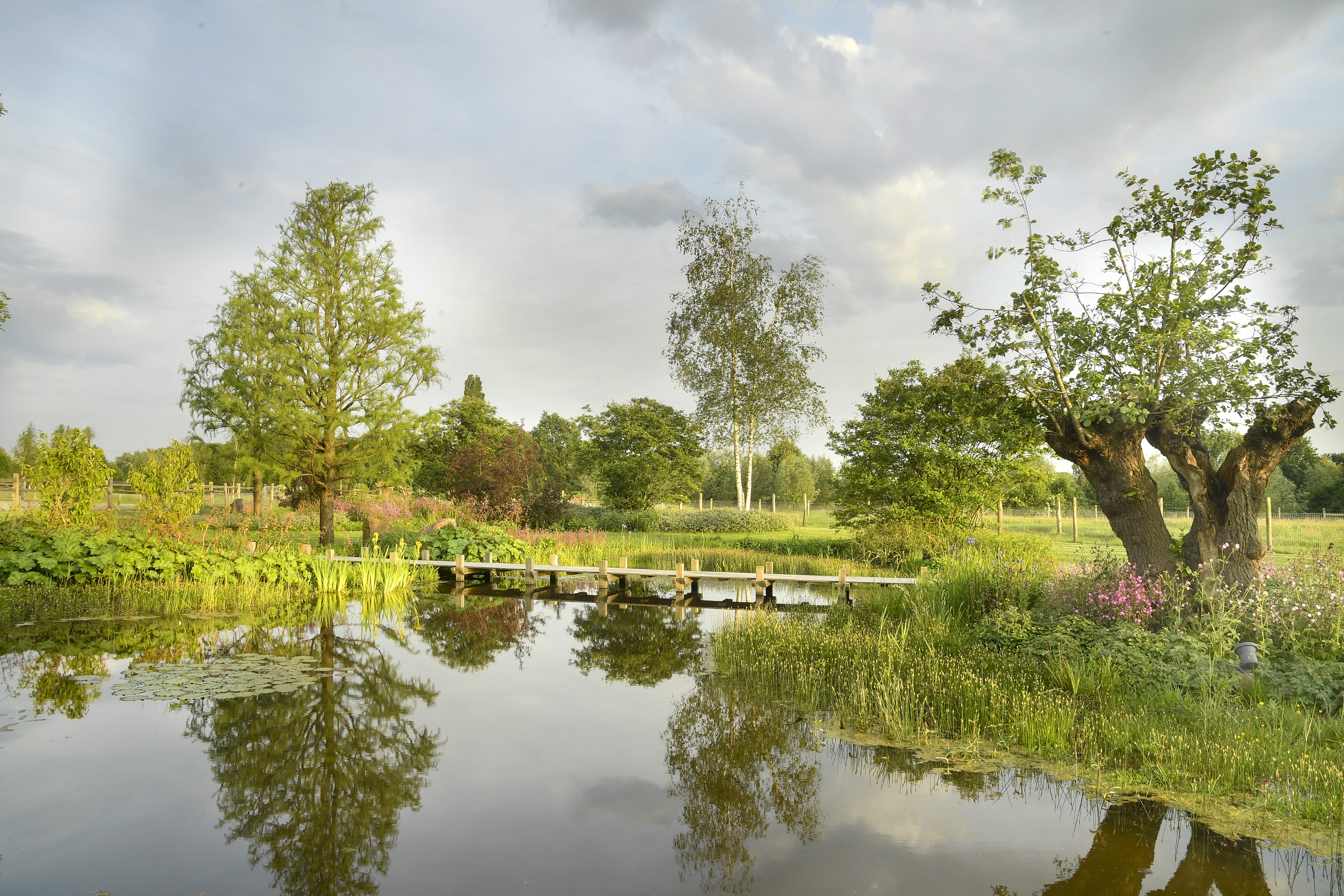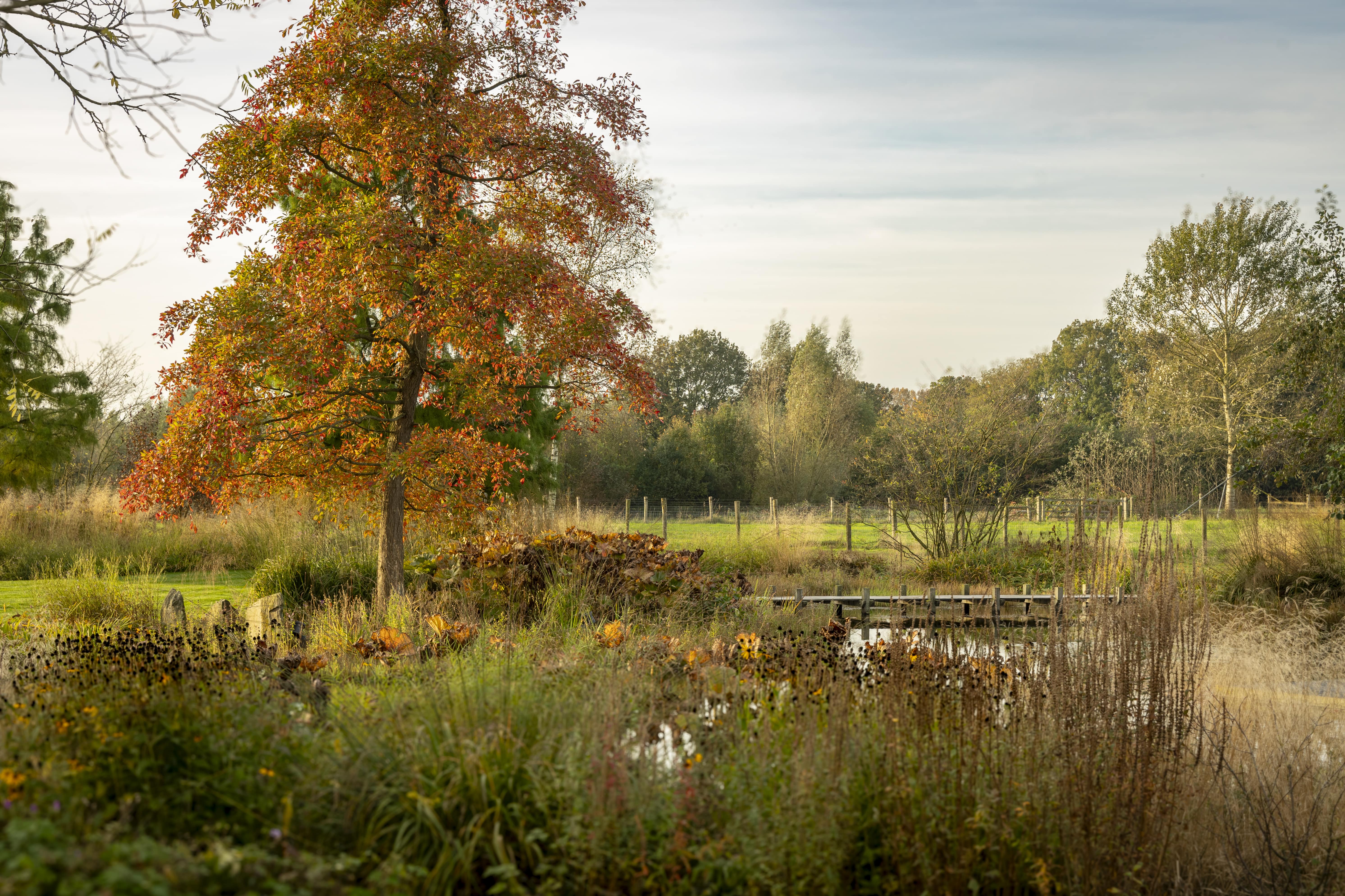 Durch die Arbeit mit ausgewachsenen, charaktervollen Exemplaren erhält die Landschaft sofort die Ruhe und Natürlichkeit eines ausgewachsenen Waldes. Die Bäume bestimmen den räumlichen Charakter, verleihen der flachen Brabanter Landschaft Höhe und sorgen für einen fließenden Übergang zwischen den organischen Formen des Gartendesigns und der geschützten Natur drumherum.